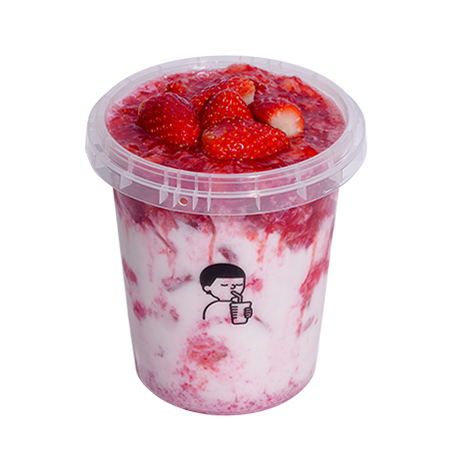버켓에 생딸기 과육과 고소한 우유를 가득 넣은 생딸기 버켓라떼